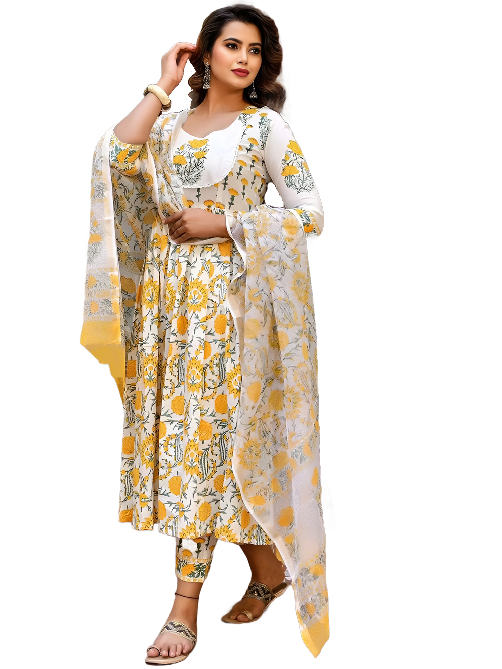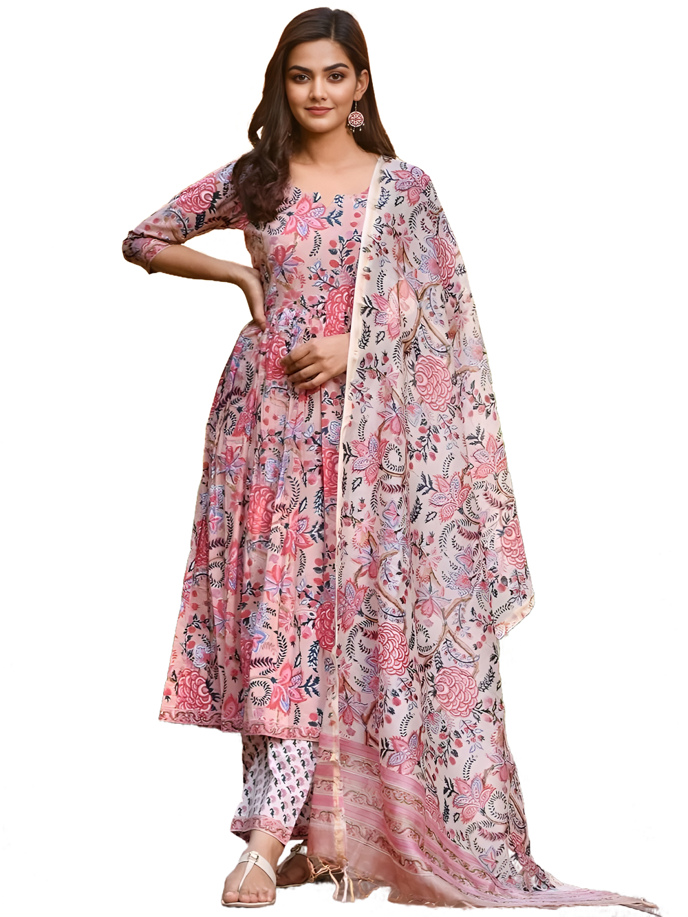 Floral Printed Round Neck Flared Anarkali Kurta With Trousers & Dupatta
